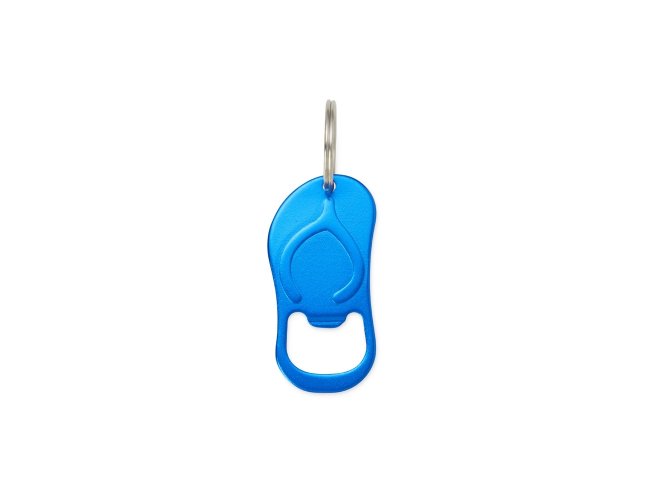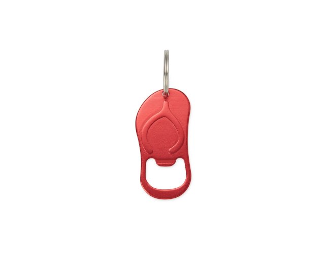 Chaveiro abridor metálico em formato de chinelo.