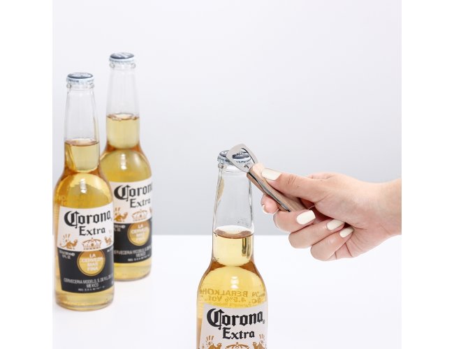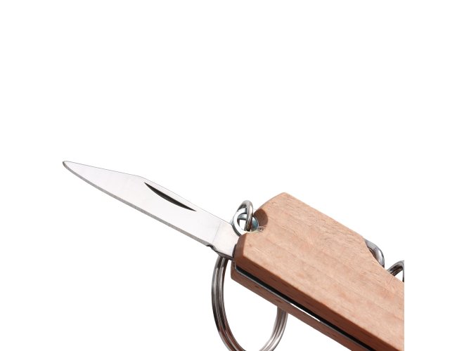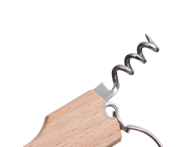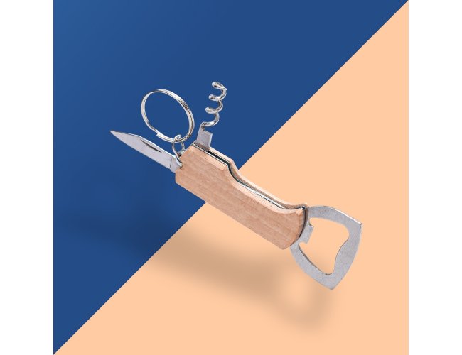 Chaveiro multifunções com estrutura em madeira e aço inox, possui três utilidades em um só acessório: um abridor de garrafas, um saca-rolhas e um canivete.