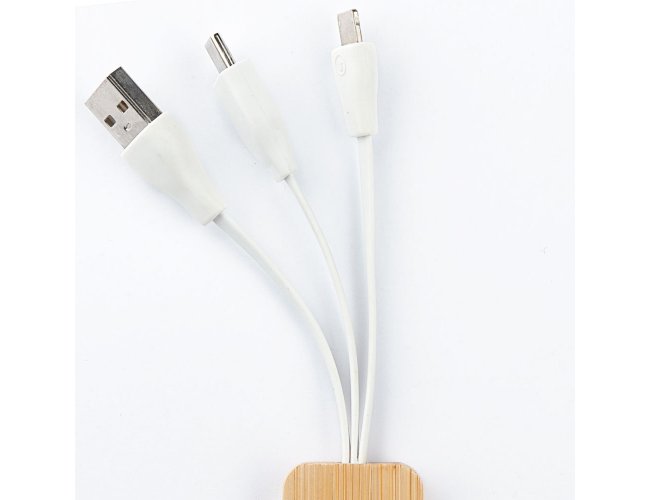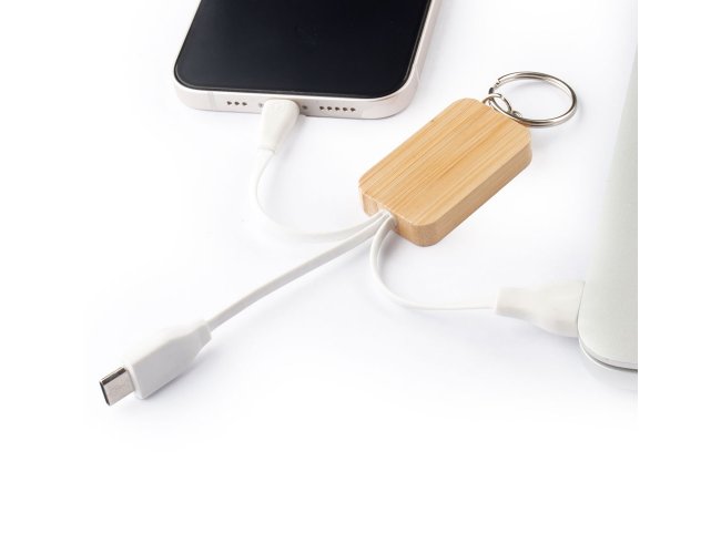 Chaveiro de bambu com cabo para carregamento, entrada usb, lightning e tipo C.