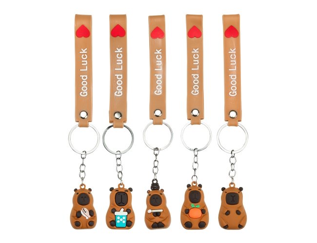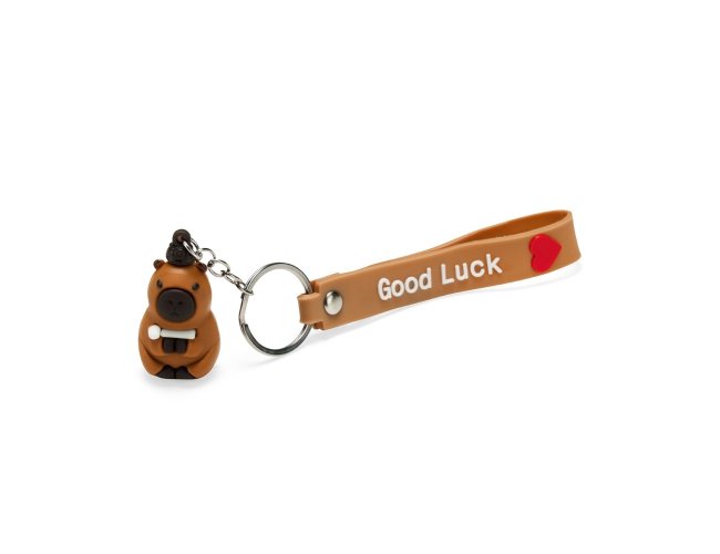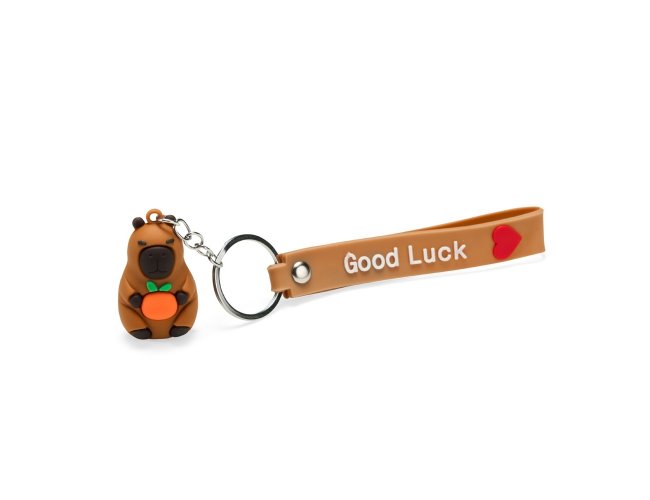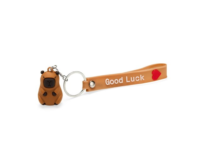 Chaveiro com textura emborrachada e em formato de capivara, acompanhado de argola metálica e correia plástica flexível.