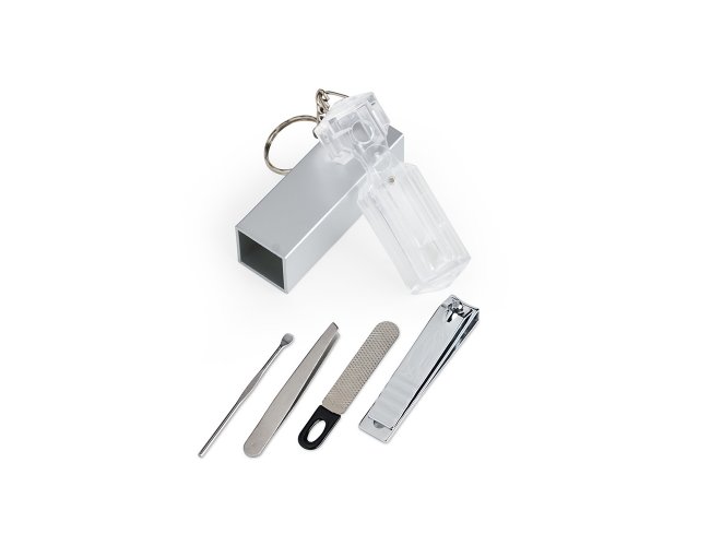 Chaveiro kit manicure 4 peças em estojo plástico. Possui lixa, pinça, empurrador de cutícula e cortador de unha preso. Estojo com berço plástico para acomodação das peças.