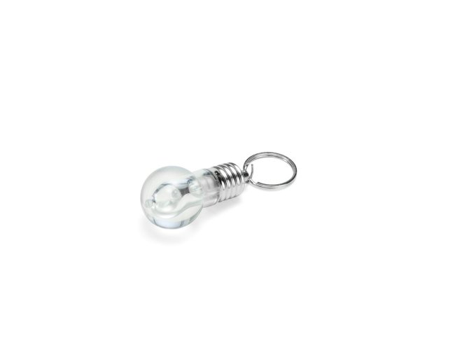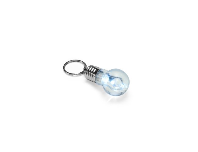 Chaveiro em formato de lâmpada, produzido em plástico e metal, com iluminação funcional em LED acionada por botão. Acompanha três baterias LR41 já embutidas.