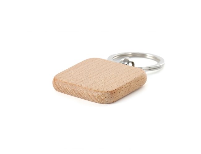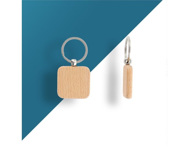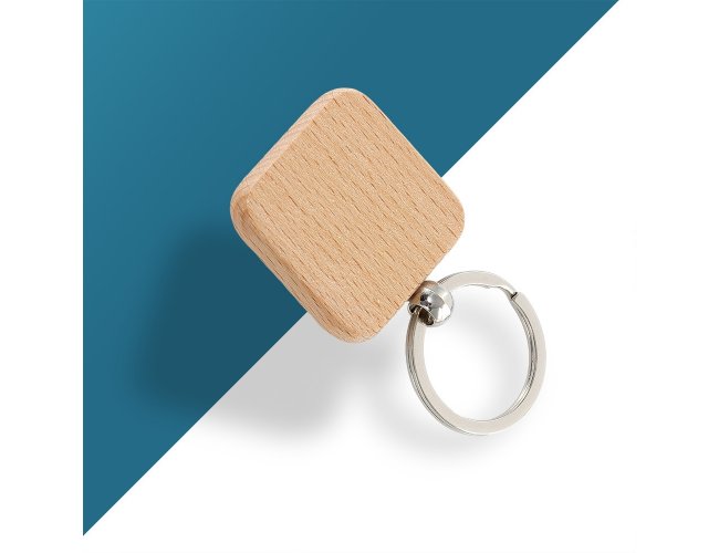 Chaveiro em madeira com formato quadrado e argola de metal.