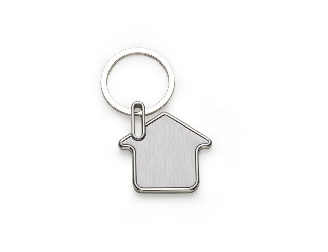 Chaveiro metal formato casa com chapa inox frente e verso lisa.