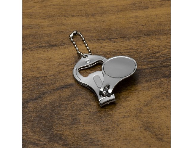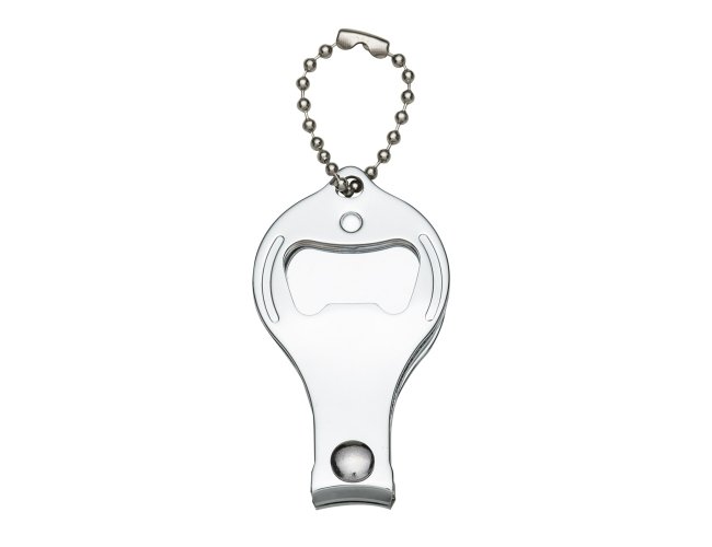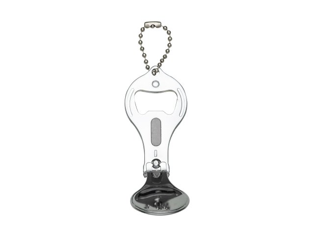 Chaveiro metal 3 em 1: abridor, cortador e lixa. Parte central circular ideal para gravações, detalhe de traços no contorno circular. Lado frontal com detalhes em relevo nas laterais e pequeno círculo acima do abridor. Para utilizar o cortador basta rotacionar a peça cirular e levantá-la. Acompanha correntinha.