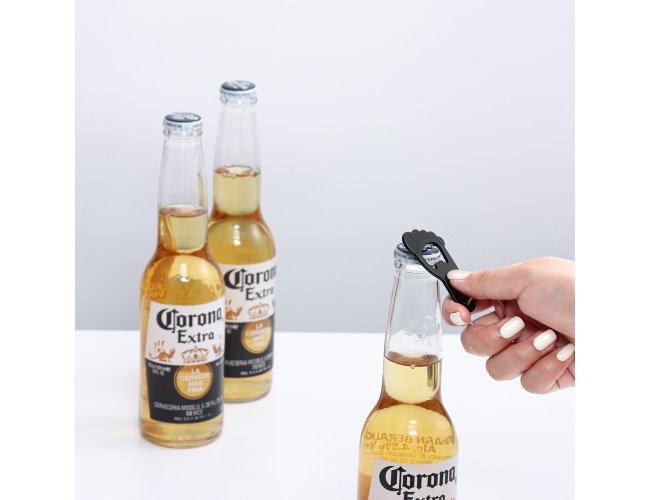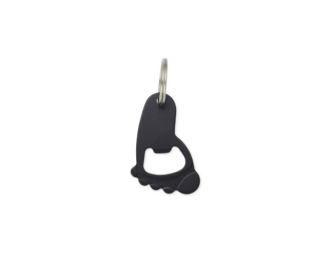 Chaveiro abridor de garrafas em metal com um formato que remete a um pé e argola de ferro niquelado.