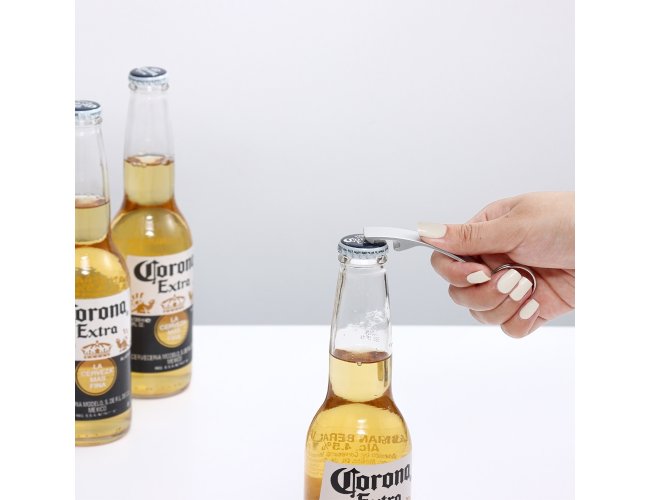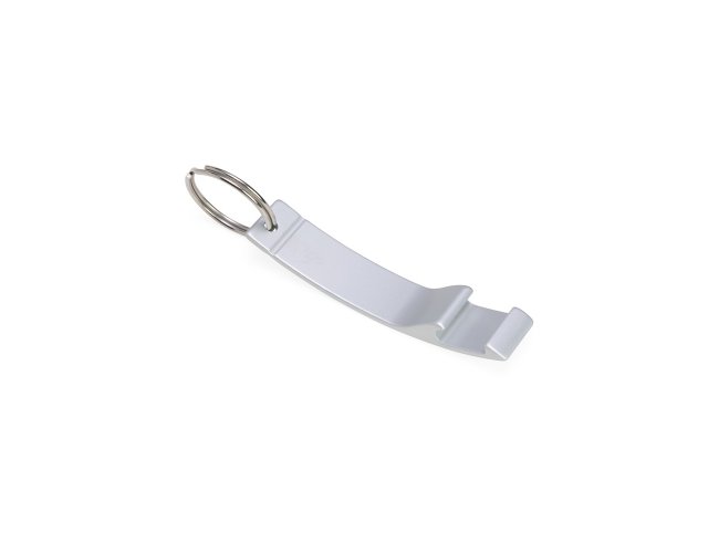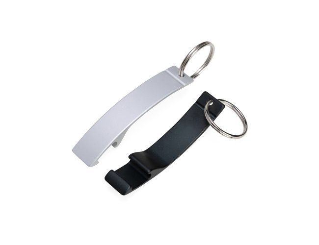 Chaveiro abridor com acabamento fosco, design curvo e argola de ferro niquelado.