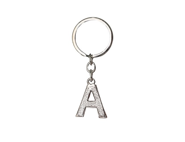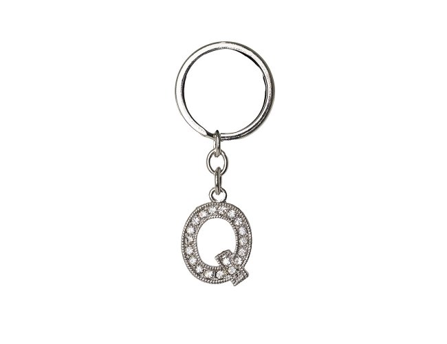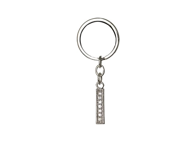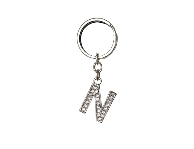 Chaveiro de metal, formato letra com detalhes em pedras brilhantes.