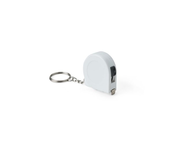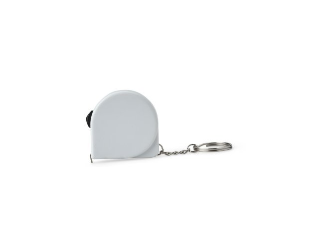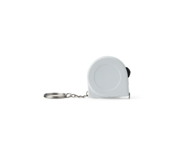 Chaveiro trena em plástico com argola metálica e fita de aço para medição com alcance de até 2 metros e marcações em pés e polegadas.