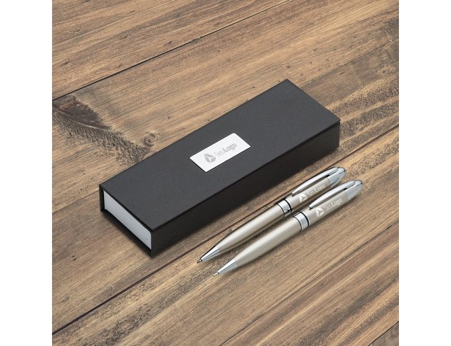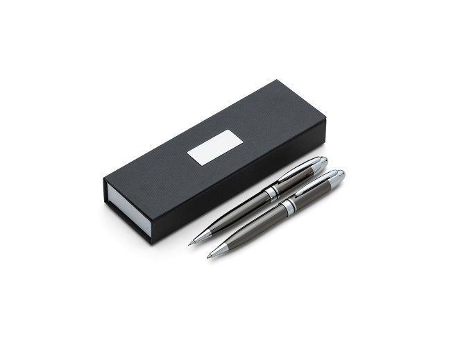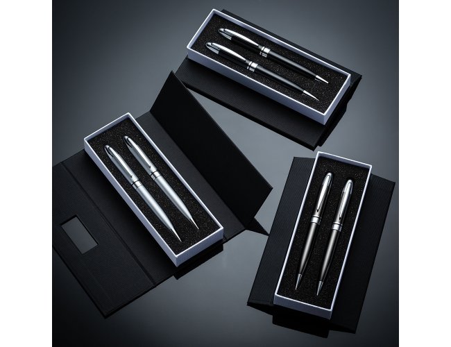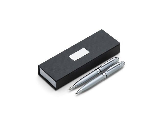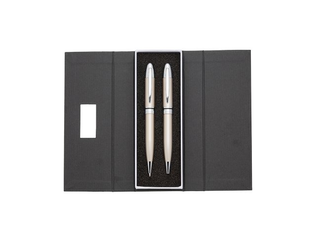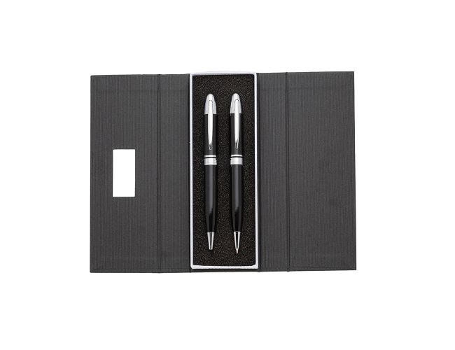 Conjunto caneta e lapiseira em estojo de cartonagem com placa central para personalização. Clip metal e anel central possui: anel fino prata, anel preto fino e um anel maior prata com relevo e acionam por giro. Estojo revestida com espuma na parte interna.