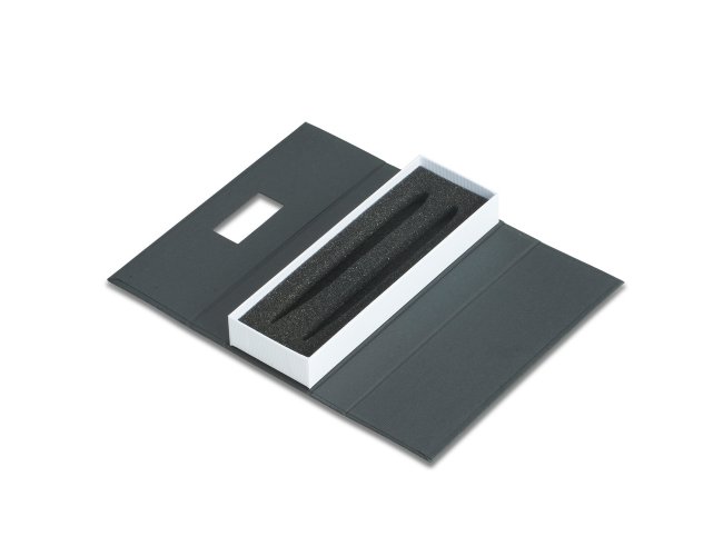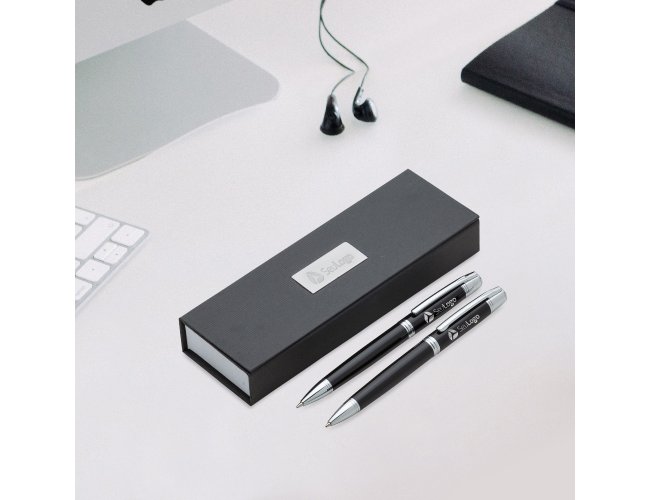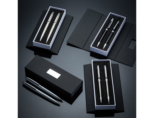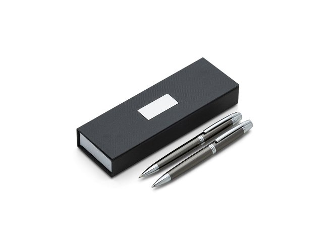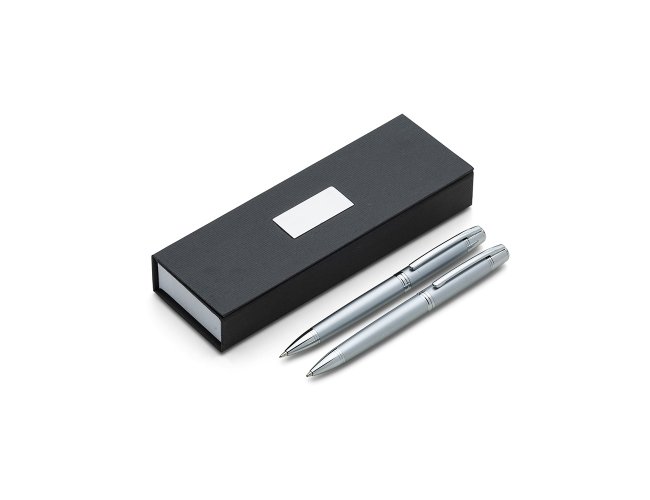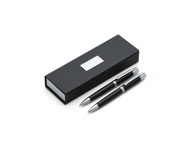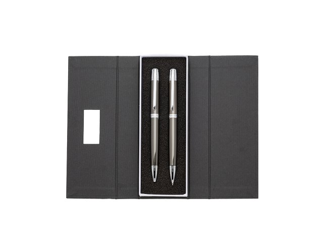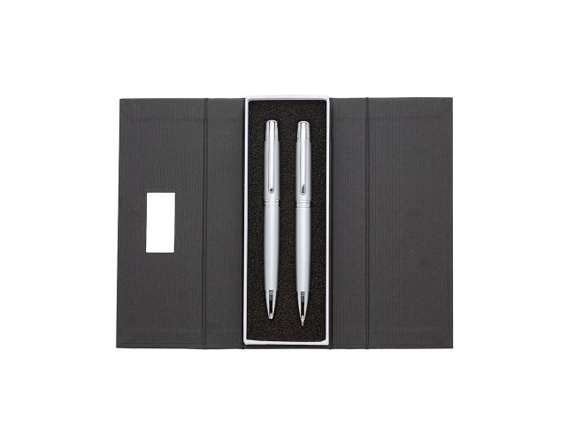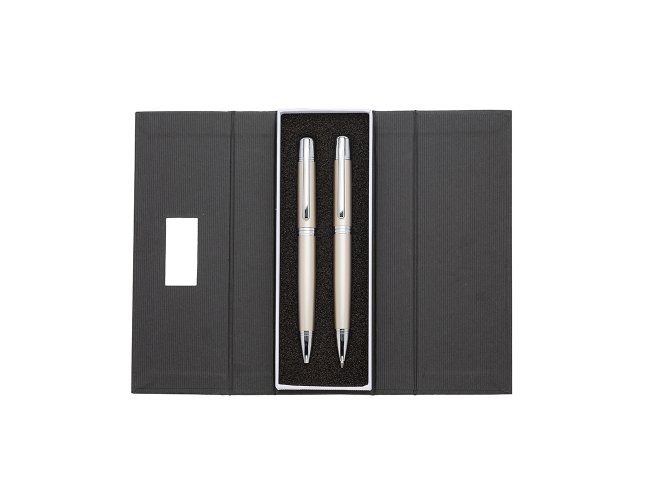 Conjunto caneta e lapiseira em estojo de cartonagem com placa central para personalização. Clip metal com dois anéis em relevo, anel centralizado e dois anéis em relevo na ponteira e acionam por giro. Estojo revestida com espuma na parte interna.