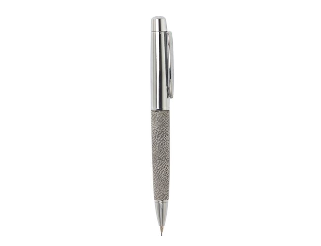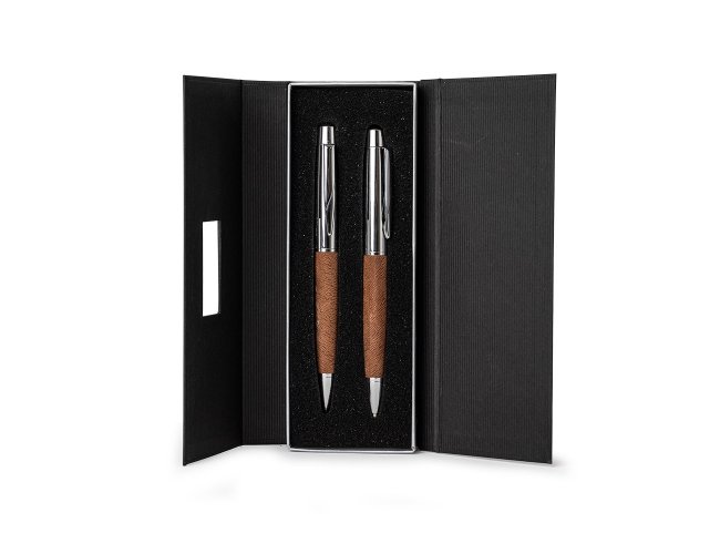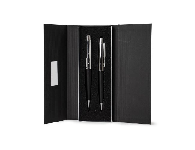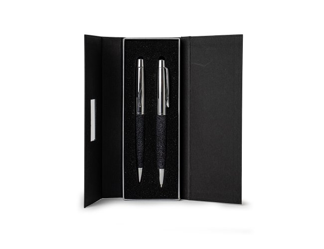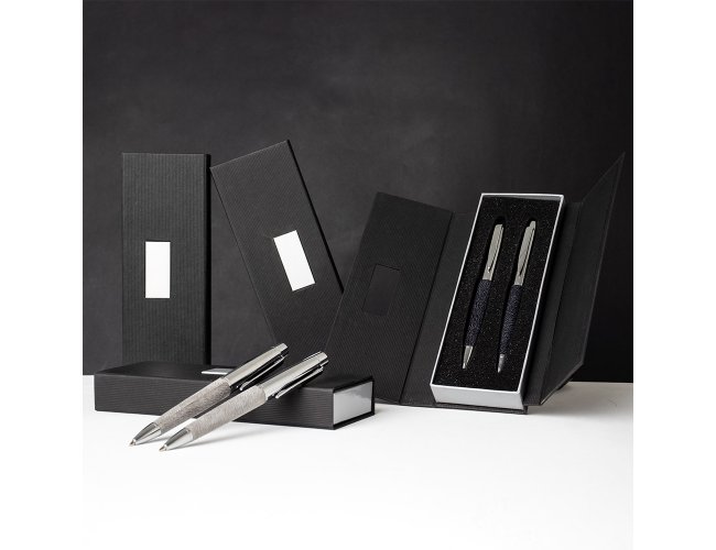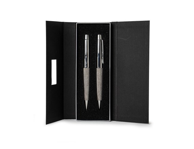 Conjunto caneta e lapiseira em estojo de cartonagem com placa central para personalização. Caneta/Lapiseira metal prata com detalhes diferenciados na parte inferior, clip metal com detalhe de linha no centro. Acionam por giro. Estojo revestido com espuma na parte interna.