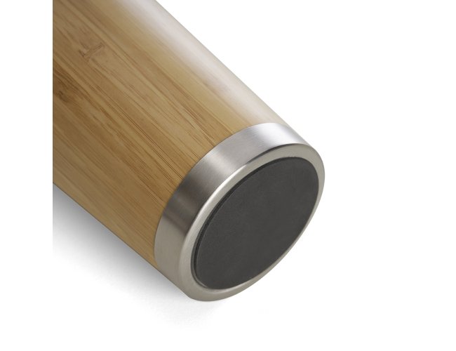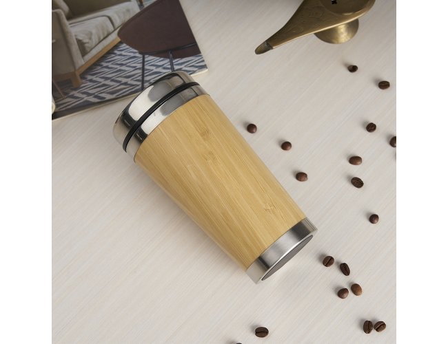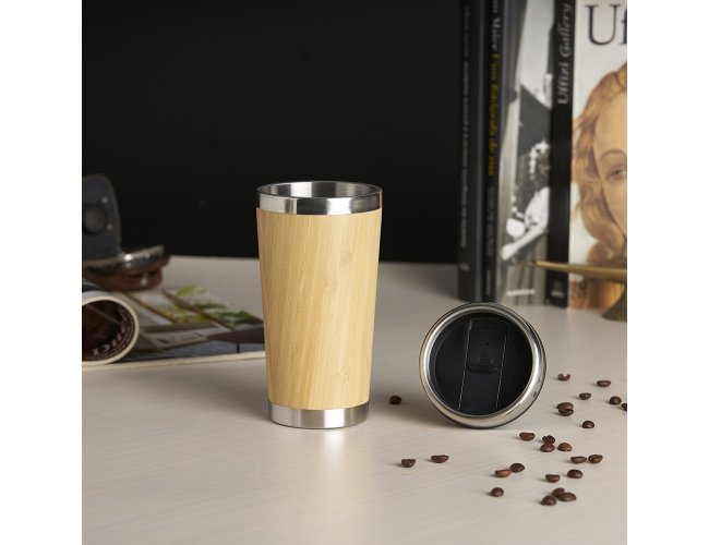 Copo Bambu de 500ml, parte interna em inox. Possui tampa com compartimento que pode ser aberto para beber.