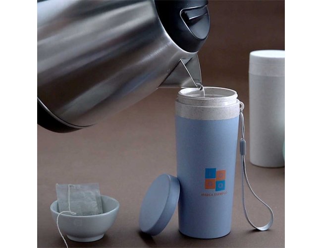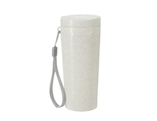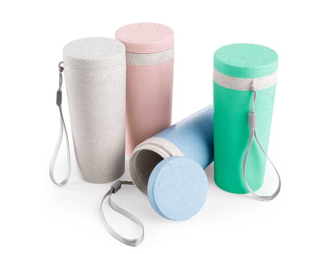 Copo isotérmico fibra de bambu 350ml com parede dupla e alça. Copo produzido em Polipropileno livre de BPA, possui uma tampa de vedação rosqueável e alça de nylon (removível) para transporte. Conserva a temperatura interna durante um período de 1 à 2 horas, mas não dispõe de isolamento térmico. O copo pode ser levado a lava-louças, geladeiras e micro-ondas.