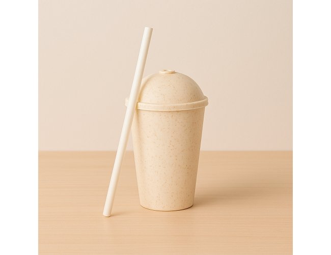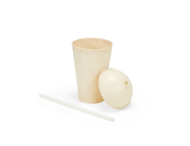 Copo produzido em fibra de madeira com tampa e capacidade de até 450ml. Acompanha canudo plástico para encaixe na tampa.