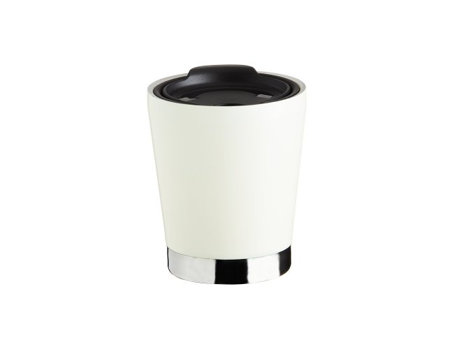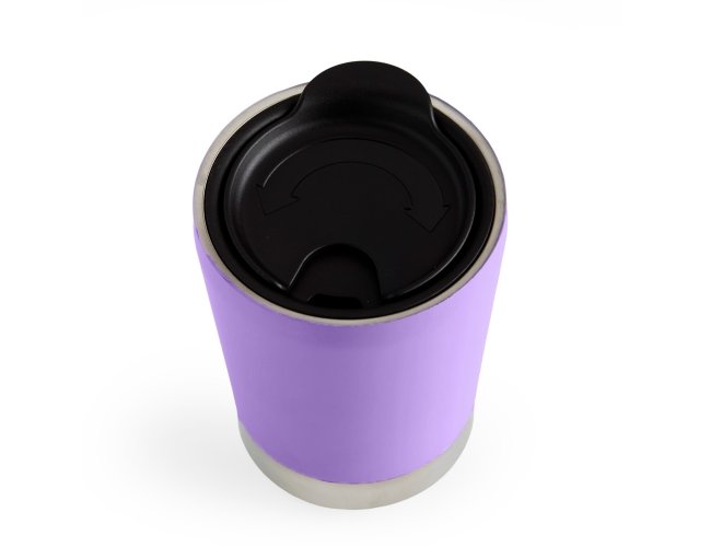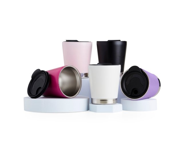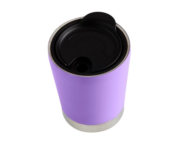 Copo inox 304 parede dupla com capacidade de 300ml, possui tampa plástica de encaixe com acesso ao bocal e área para canudo (não acompanha).
