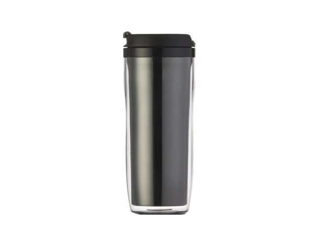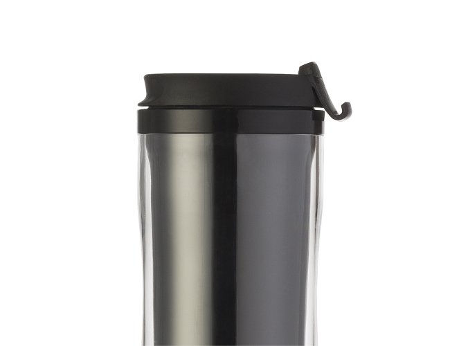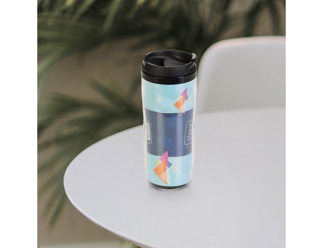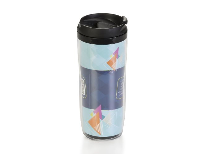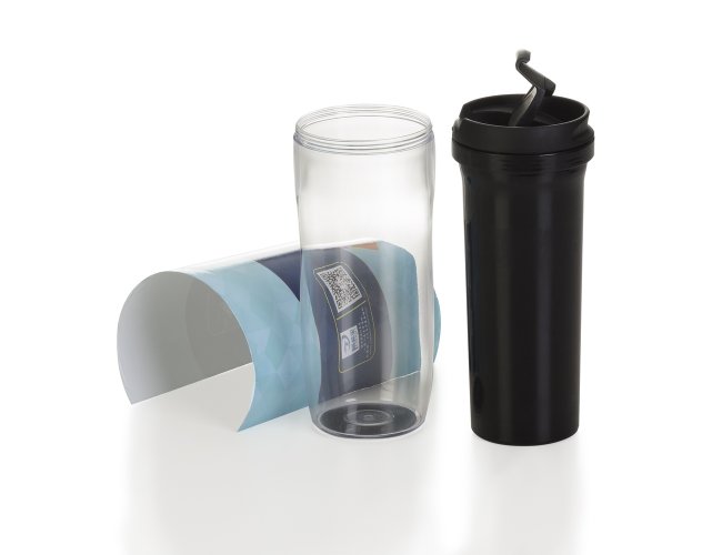 Copo plástico 350ml porta foto. Possui tampa plástica com ?alavanca? para abrir/fechar compartimento para beber. Copo preto em pvc, basta rosqueá-lo para tirar da base acrílica. Copo acrílico com o fundo externo emborrachado. Para colocar a foto basta envolver o papel sob o copo preto e encaixá-lo sob a base acrílica.