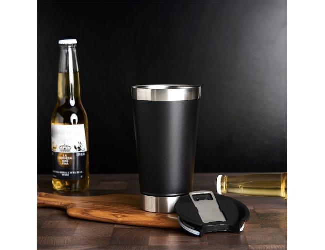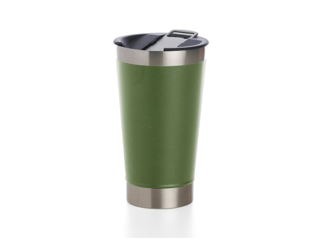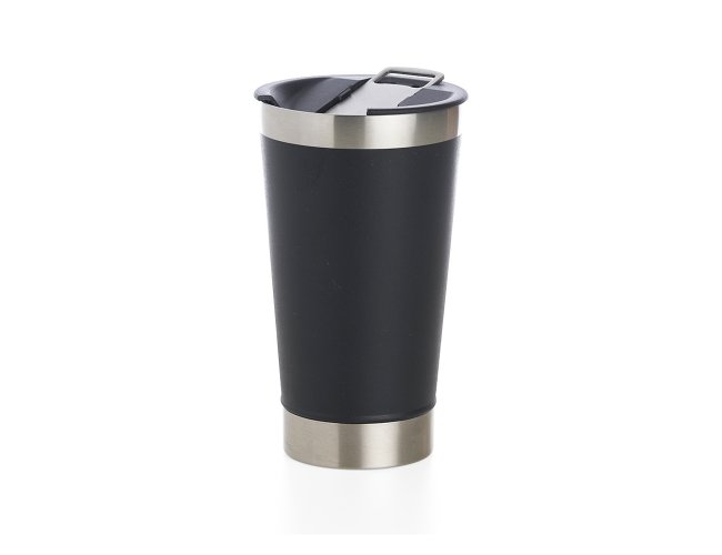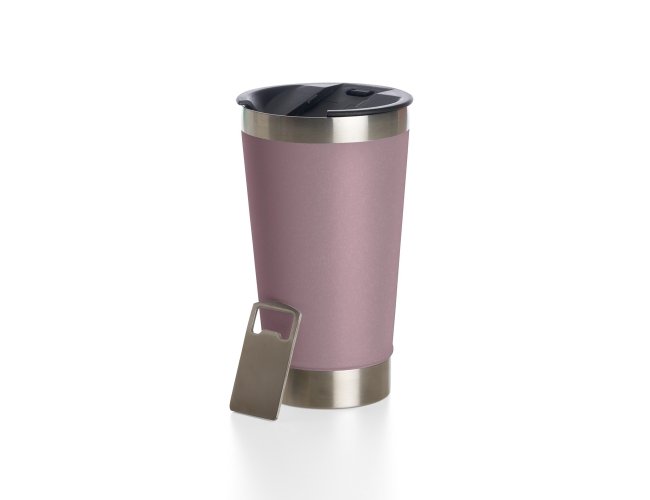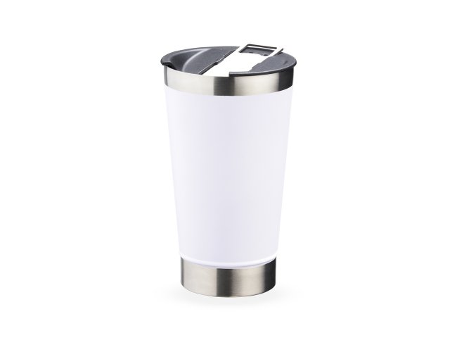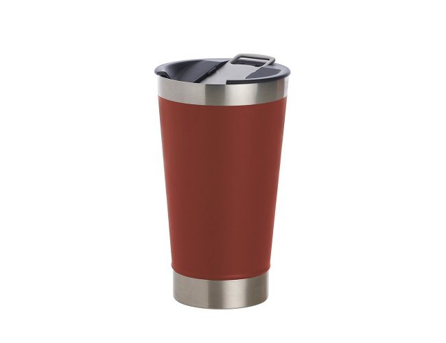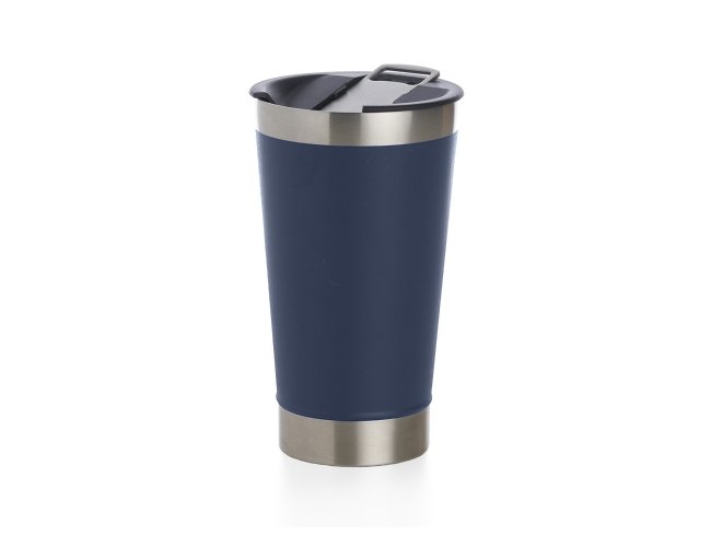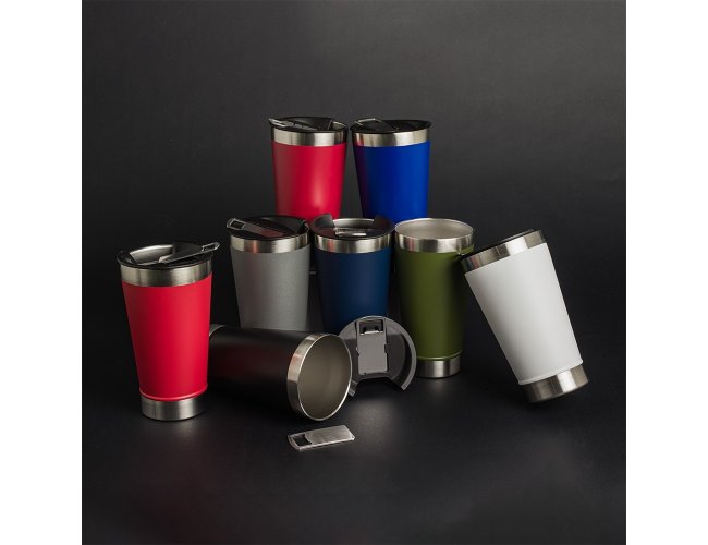 Copo térmico de inox com acabamento liso e capacidade 500ml, material livre de BPA. Contém tampa com abridor.
