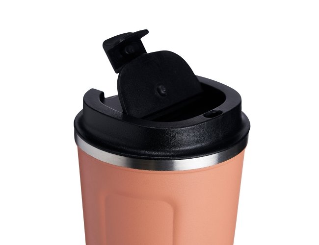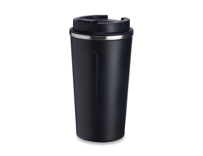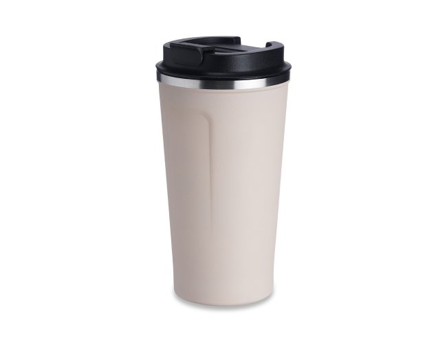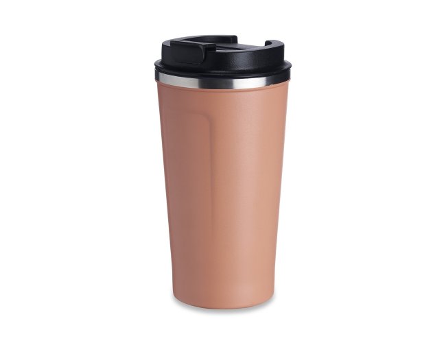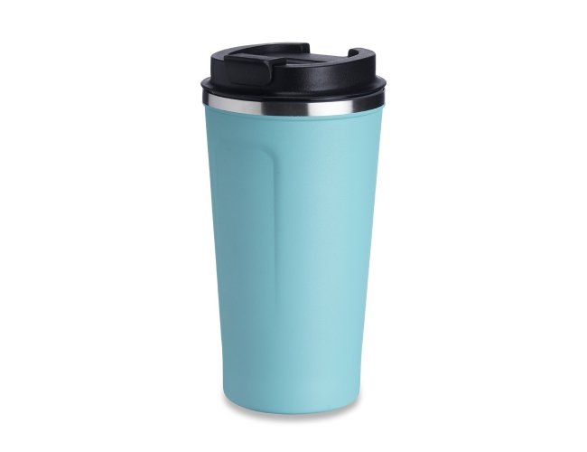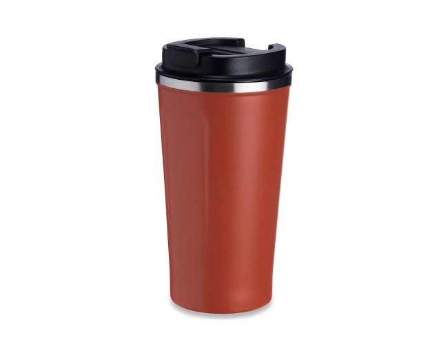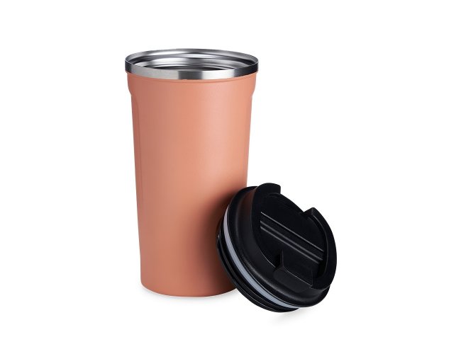 Copo térmico de inox 500ml com parede dupla, parte inferior com borracha antideslizante e tampa rosqueável com abertura de bocal.