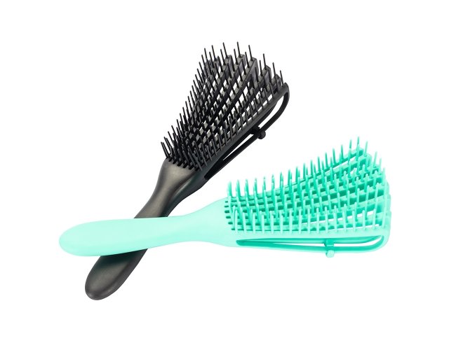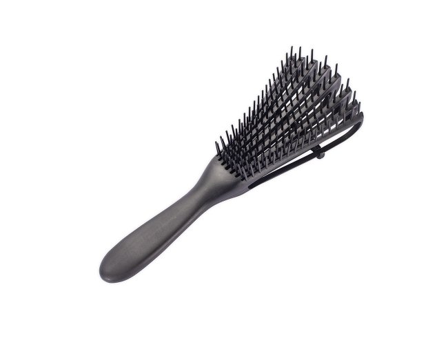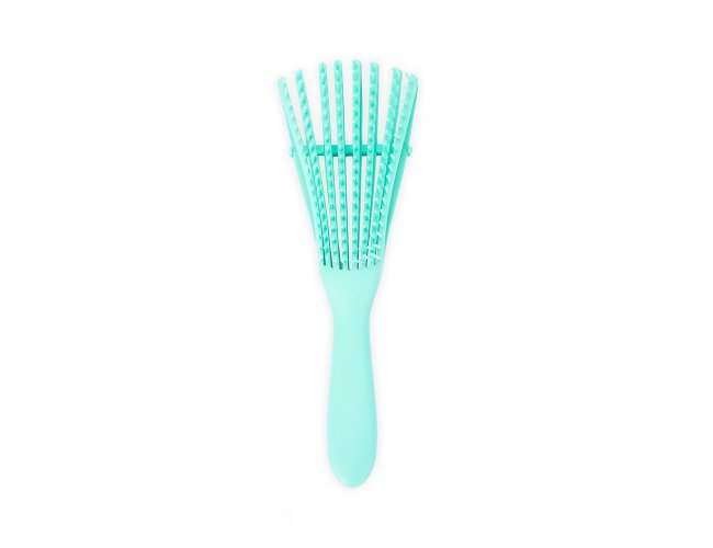 Escova em plástico com formato ergonômico e cerdas flexíveis posicionadas em alturas diferentes, que desembaraçam os fios sem puxar ou quebrar e ainda massageiam o couro cabeludo.