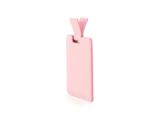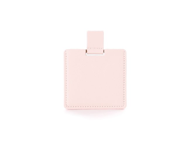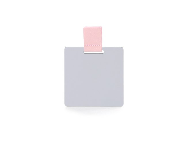 Espelho inquebrável de aço inoxidável ultra fino com verso escovado e alça em couro sintético. Acompanha estojo de couro sintético.