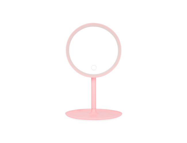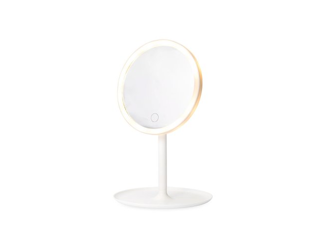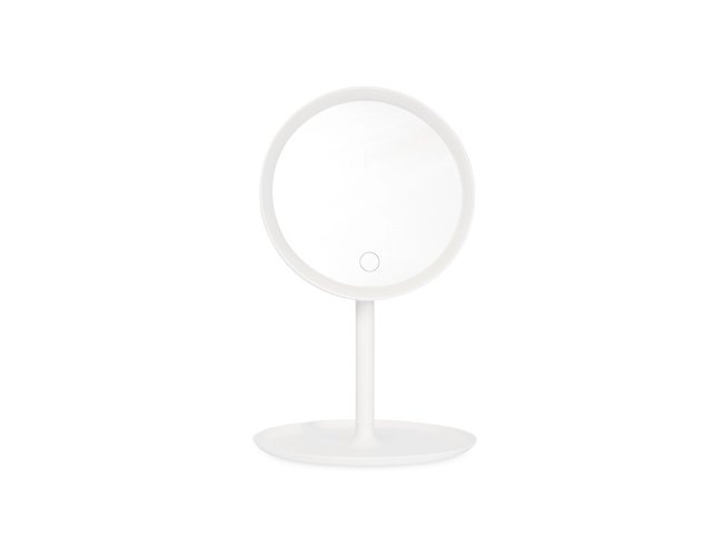 Espelho de mesa com estrutura plástica de fácil montagem e rotação de até 90 graus. Possui iluminação em LED recarregável com três níveis de intensidade ajustáveis pelo botão de toque no espelho. Acompanha cabo USB-C.