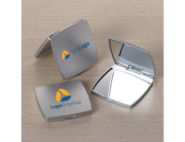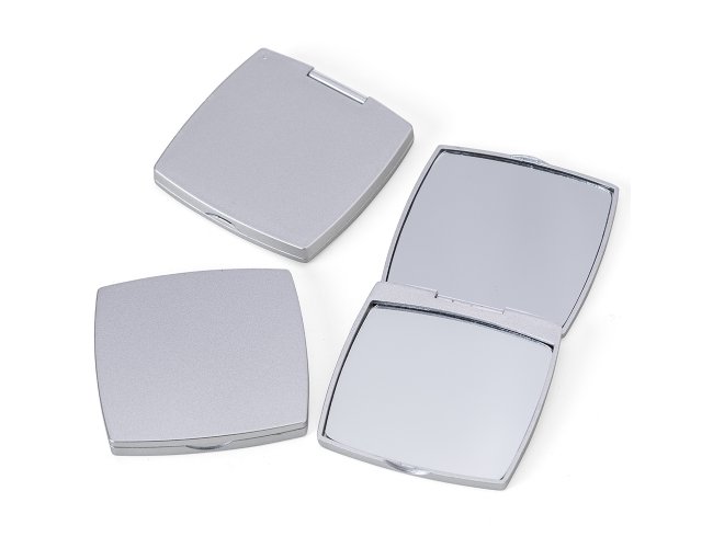 Espelho duplo sem aumento com moldura plana de bordas arredondadas feita em plástico.