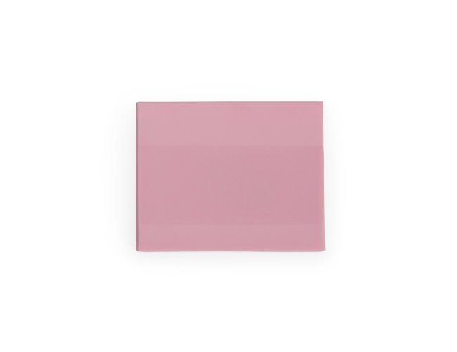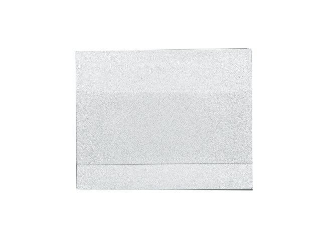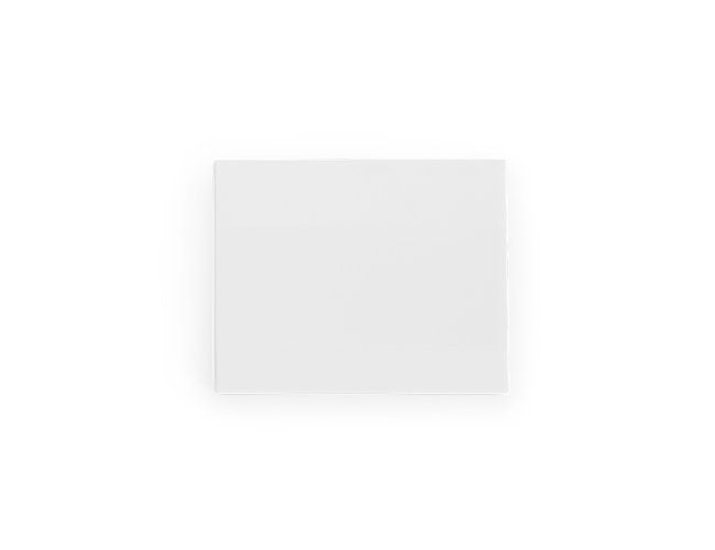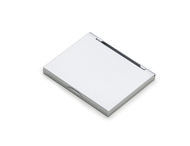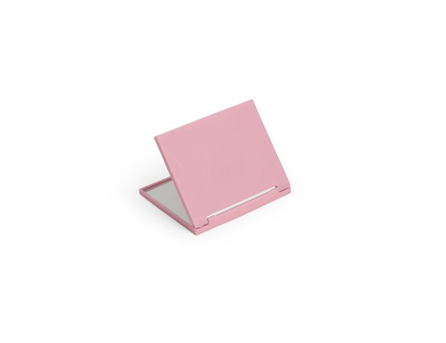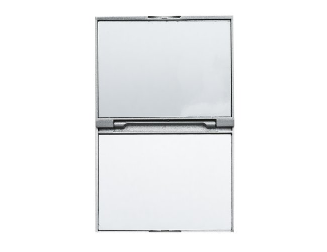 Espelho retangular duplo sem aumento, material em plástico resistente com uma faixa na superfície e verso liso.