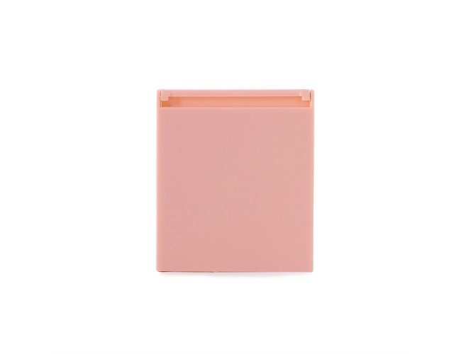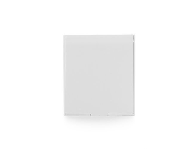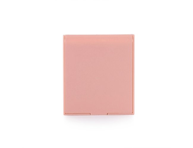 Espelho de vidro sem aumento com moldura arredondada em plástico. A tampa protetora, quando inclinada para trás, funciona como apoio para mantê-lo aberto sobre superfícies planas.