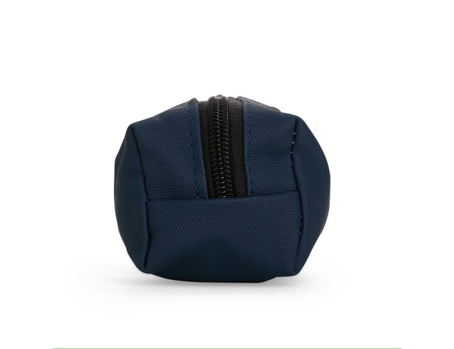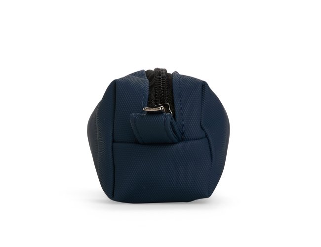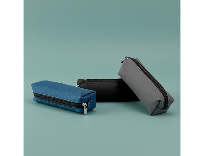 Estojo confeccionado em couro sintético com fechamento em zíper e uma pequena alça para fixação em chaveiro ou gancho.