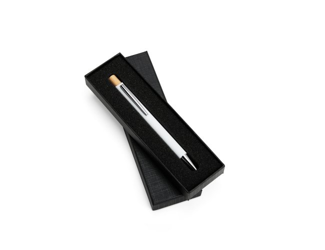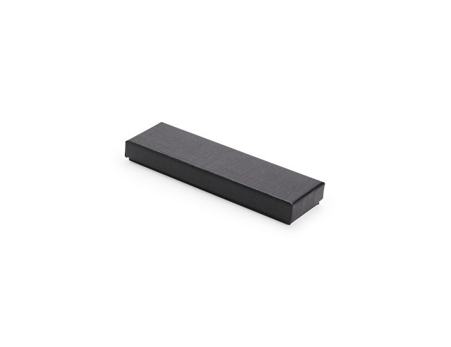 Estojo feito em papelão e revestimento interno removível de camada dupla em espuma com espaço para acomodar uma caneta ou lapiseira.