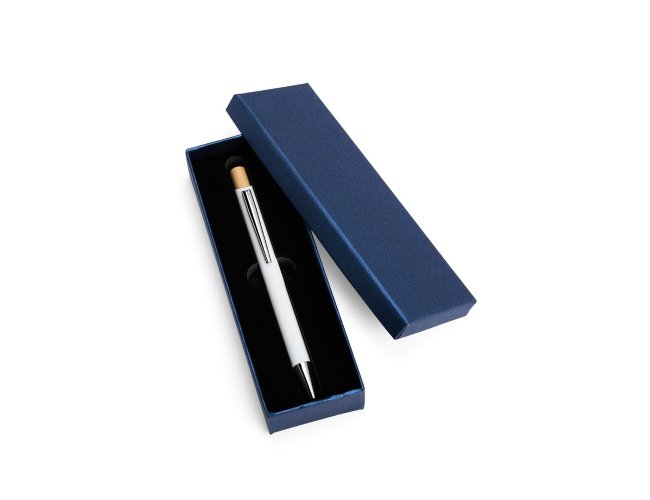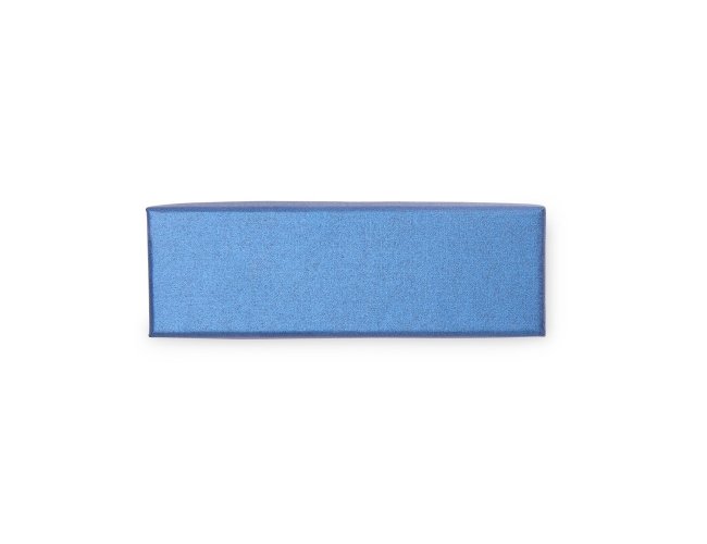 Estojo em papelão e revestimento removível de duas camadas em espuma com espaço para guardar uma caneta ou lapiseira.