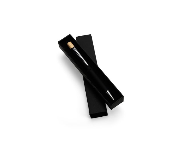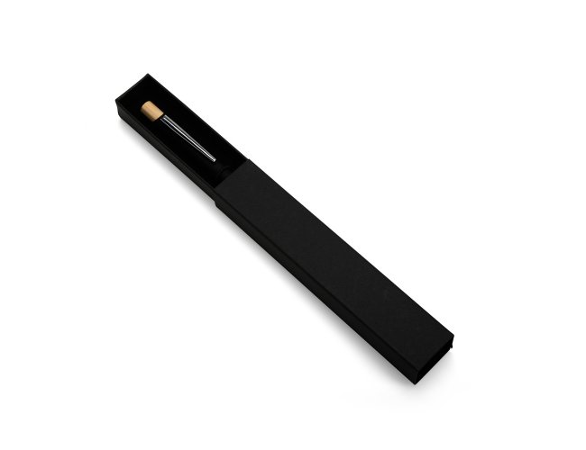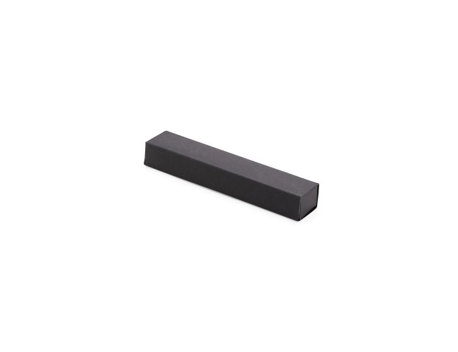 Estojo em papelão com abertura estilo gaveta e berço aveludado e elástico para fixar uma caneta.