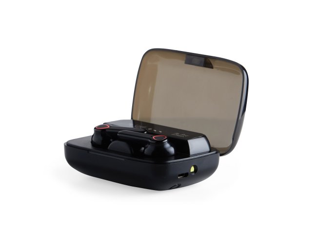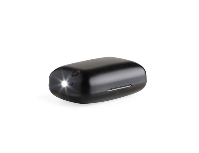 Fone de ouvido bluetooth com comandos touch e case carregador. Com lanterna e display de bateria, o case pode ser utilizado também como um power bank de baixa capacidade para emergências. Material plástico. Acompanham 2 pares de eartips em diferentes tamanhos, lanterna, alça e cabo USB.