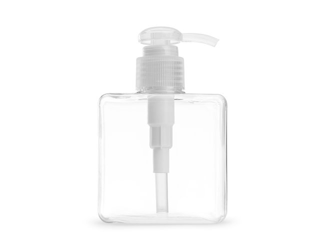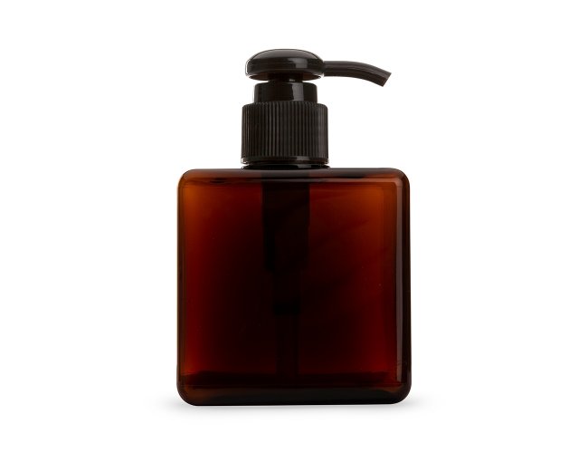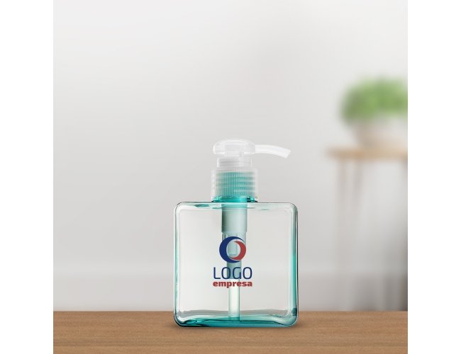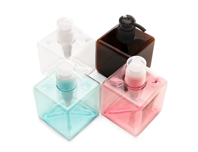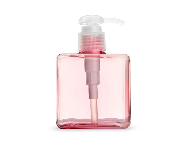 Frasco 280ml produzido em plástico colorido fosco, tampa rosquável com válvula pump e trava de segurança, basta pressionar e girar a parte superior para travar o produto.