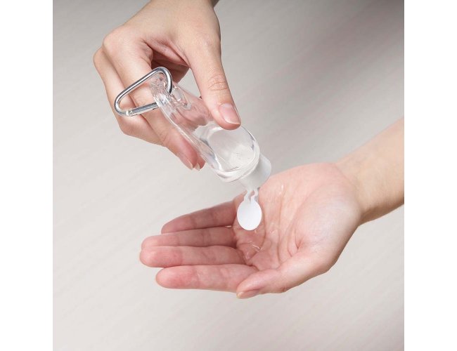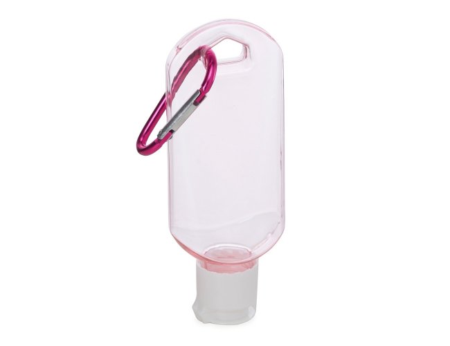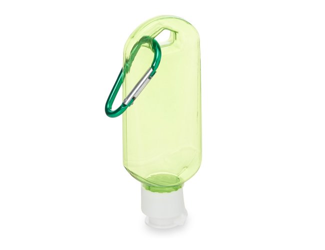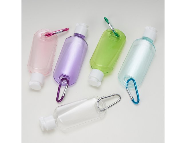 Frasco plástico com capacidade de 55ml, contém tampa branca com encaixe rosqueável e acompanha chaveiro mosquetão para transporte.