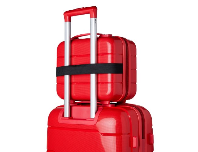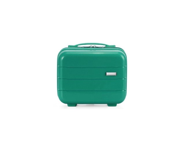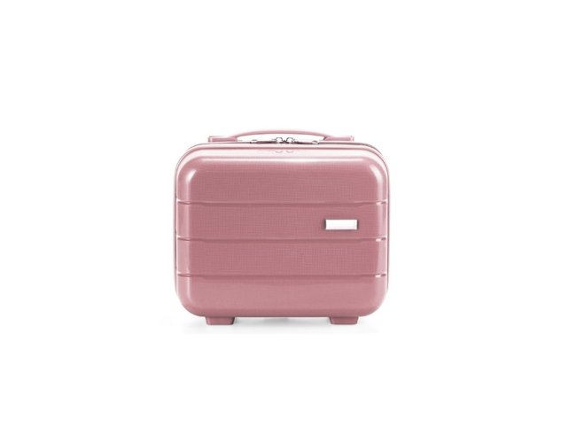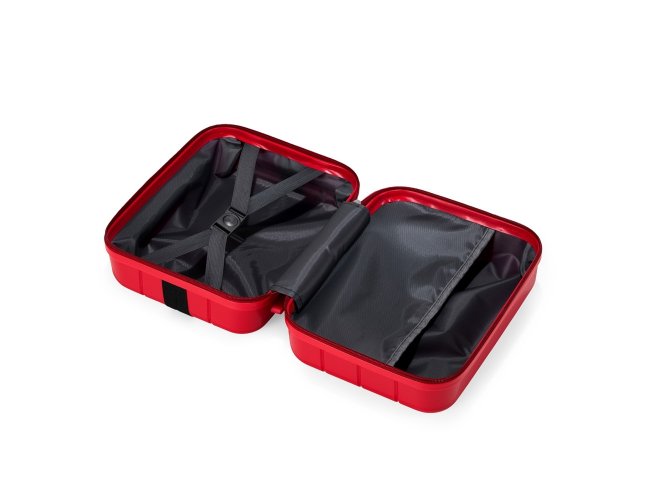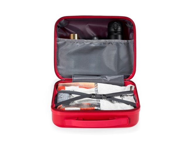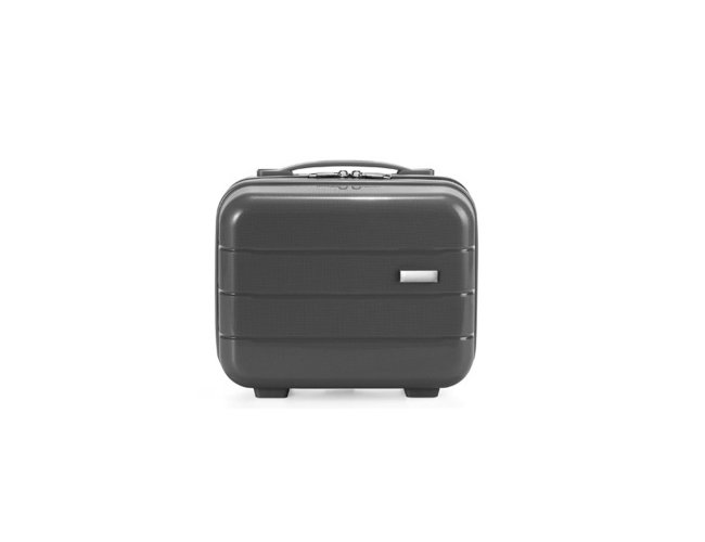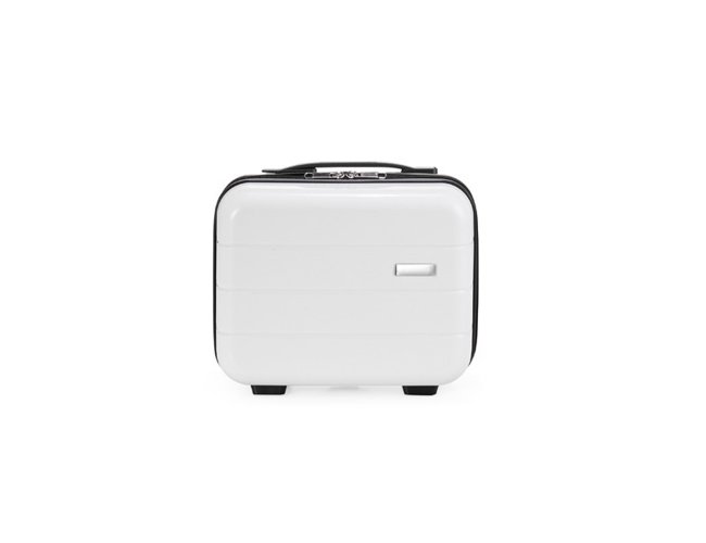 Frasqueira de plástico (casca dura). Possui compartimento interno, elástico de segurança, alça para encaixe em malas de viagem e 4 apoios para maior estabilidade. Acompanha placa de personalização.