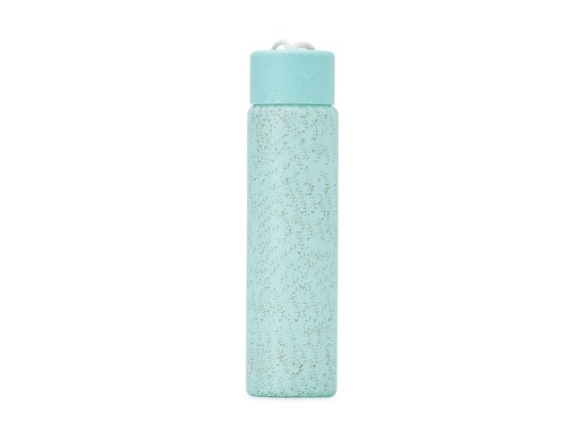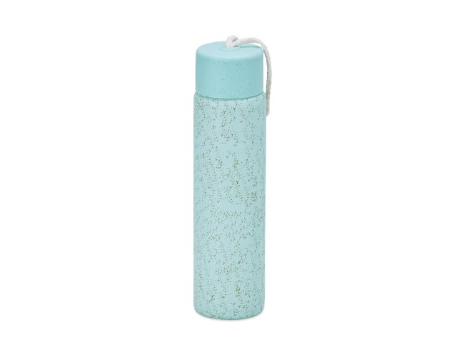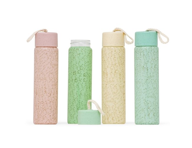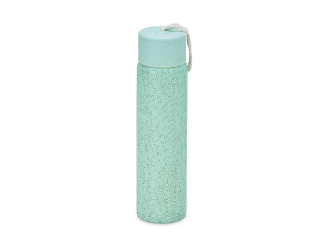 Garrafa de vidro 330ml com acabamento adesivado, tampa plástica e alça de algodão para transporte.