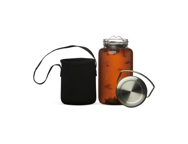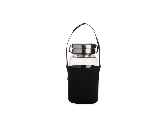 Garrafa de vidro borossilicato com capacidade de 650ml, acompanha peneira infusora e capa de neoprene com alça para transporte. Tampa de alumínio com alça para transporte.