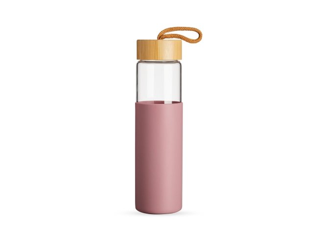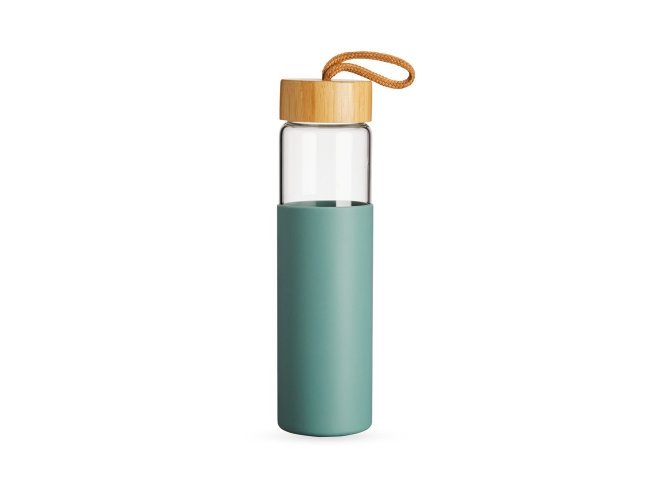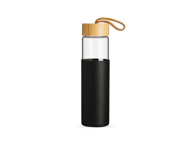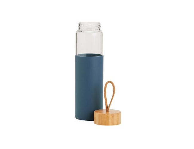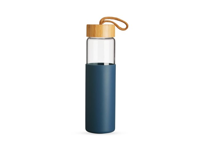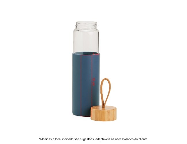 Garrafa de vidro borossilicato com capacidade de 750ml. Contém tampa de bambu com alça de algodão e luva de silicone.