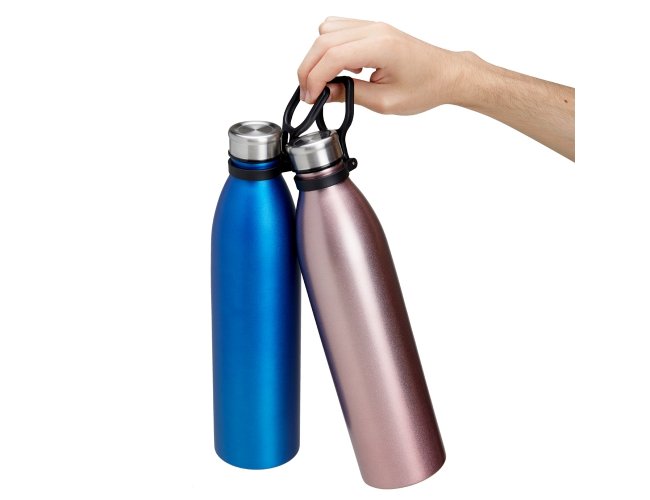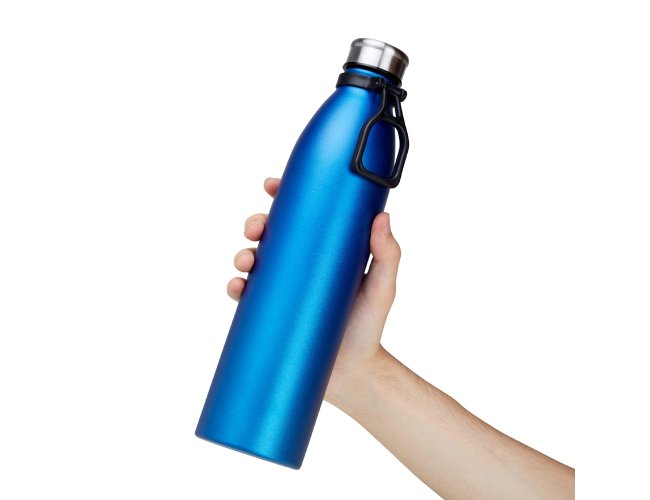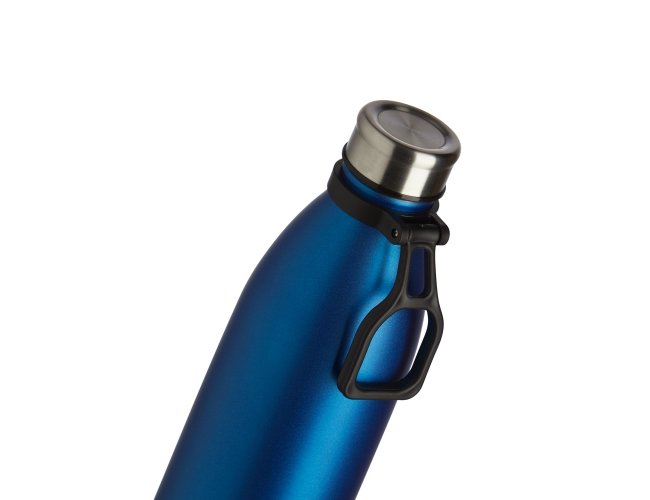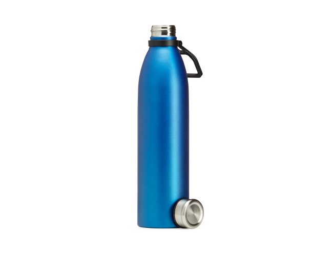 Garrafa de inox com acabamento metalizado, capacidade de 1,1 litros. Tampa rosqueável e alça plástica para transporte.