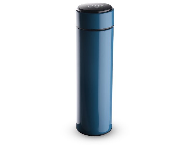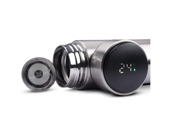 Conserva temperatura quente ou fria. Garrafa inox 450ml com parede dupla, infusor e display LED com termômetro digital na tampa para indicar a temperatura do líquido.