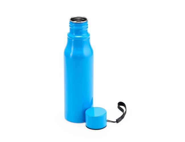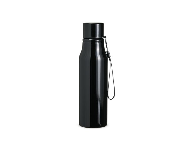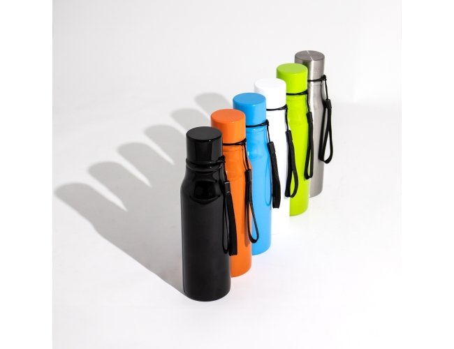Garrafa inox com capacidade de 750ml. Contém tampa rosqueável com alça para transporte.