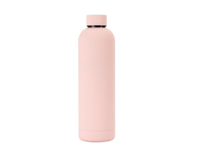 Garrafa térmica em inox 304 com pintura de acabamento emborrachado, estrutura de parede dupla, tampa rosqueável e capacidade para até 750ml.