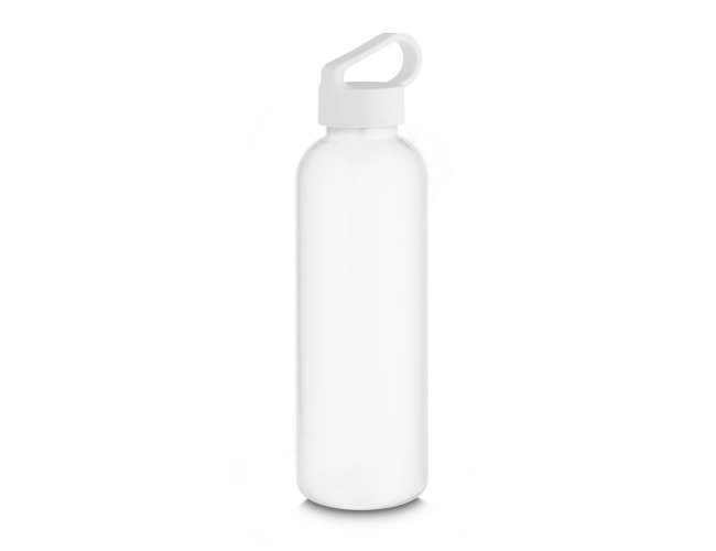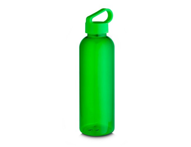 Garrafa plástica rPET 550ml livre de BPA, possui tampa rosqueável e alça para transporte.