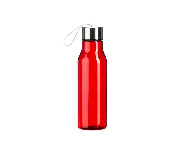 Garrafa plástica com capacidade máxima de 615ml e marcação de volume de 600ml. Possui tampa rosqueável em alumínio com alça de nylon para transporte.