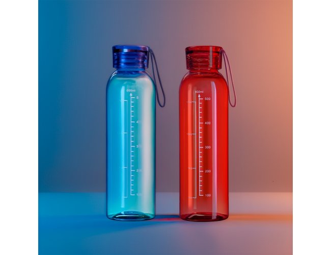 Garrafa feita em plástico livre de BPA com capacidade máxima de 640ml e marcação de volume impressa de até 600ml. Conta com tampa plástica rosqueável com alça de silicone fixa.
