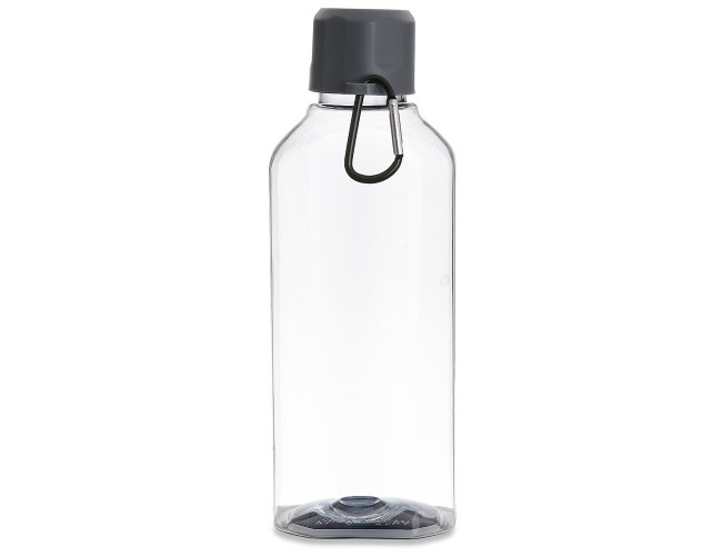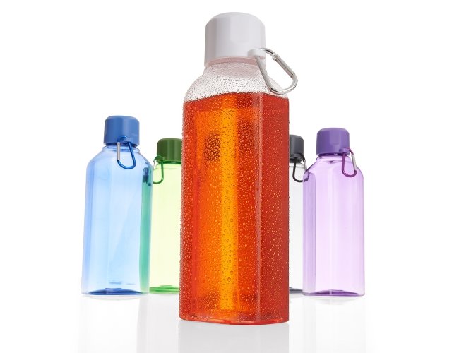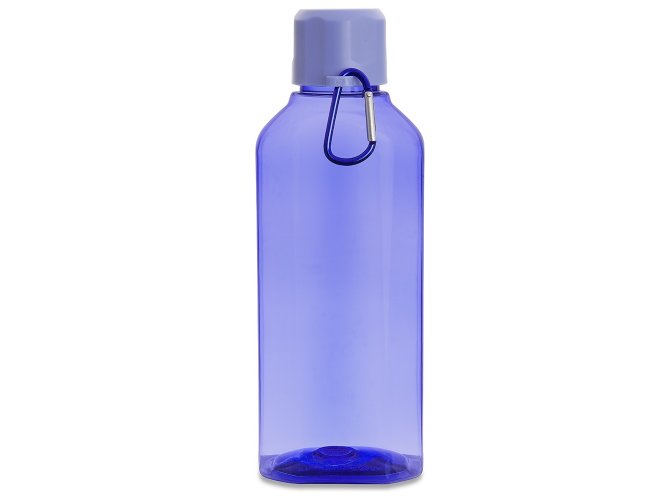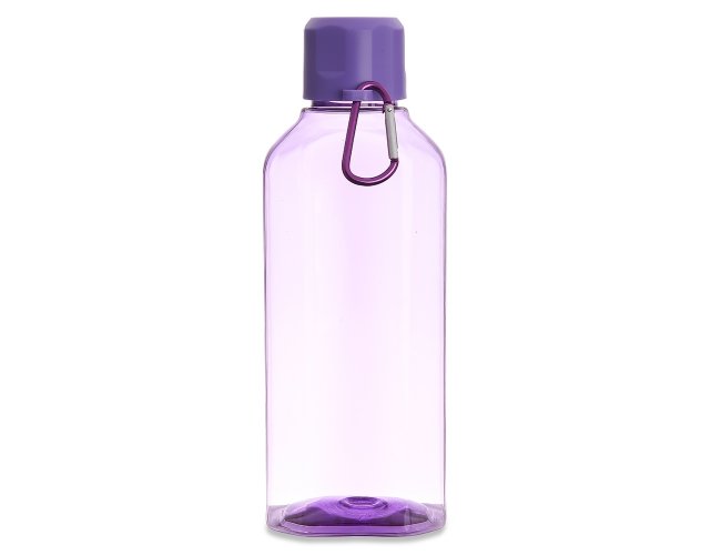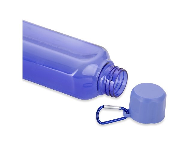 Garrafa plástica 730ml com tampa rosqueável e mosquetão colorido.