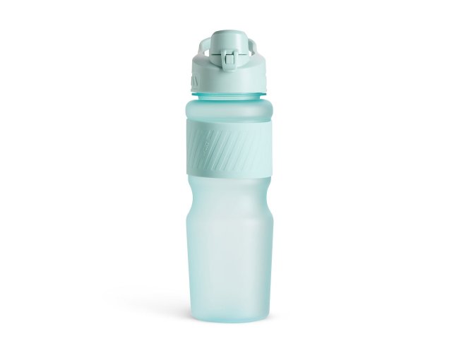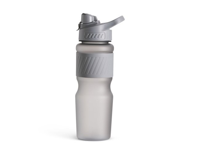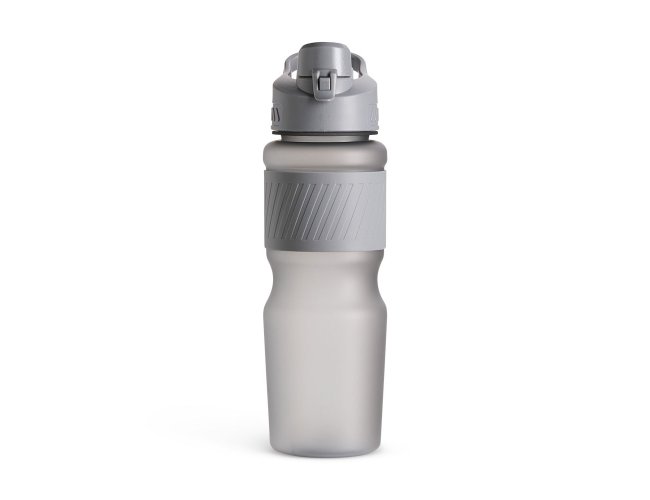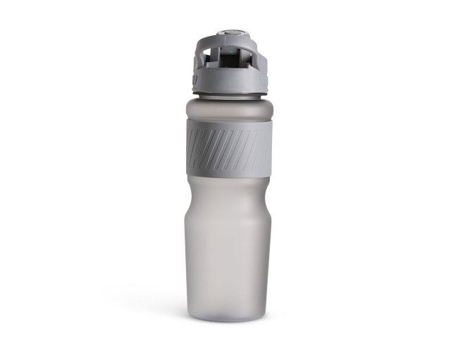 Squeeze plástico com acabamento fosco e capacidade de até 750ml. Possui luva emborrachada, tampa rosqueável com bocal e alça fixa para transporte. O bocal conta ainda com uma tampa de proteção com trava de segurança.