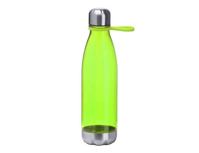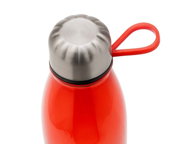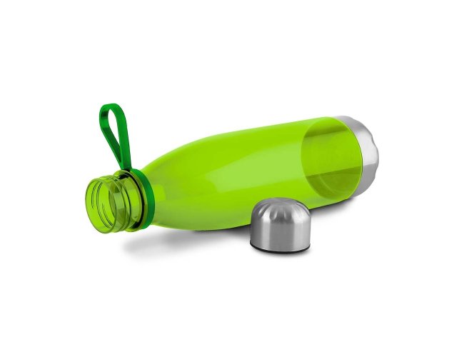Garrafa em rPET com capacidade máxima de 700ml. Possui tampa rosqueável e base metálicos, além de alça flexível de silicone.